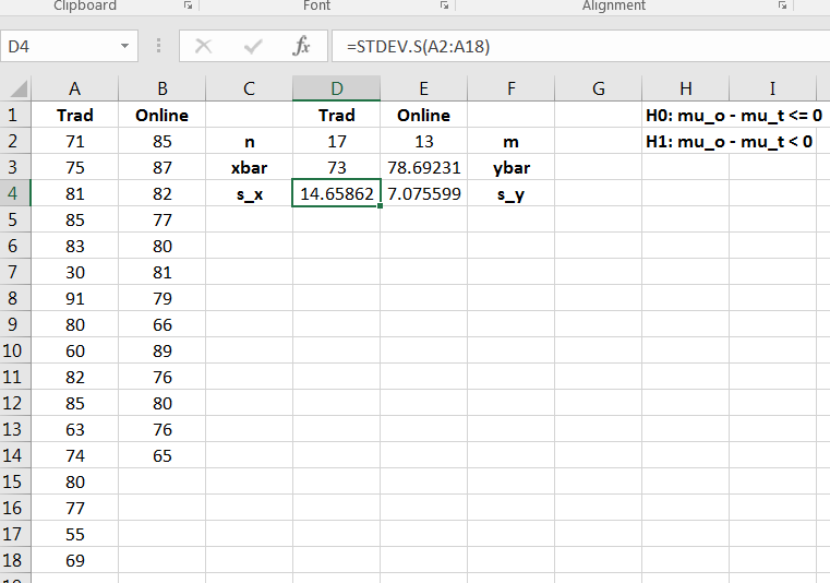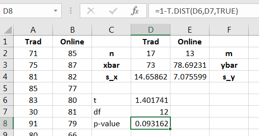 Since the -value is not larger than 0.1, we reject i.e., there is significant evidence that the true average exam score in the online courses is larger than the true average score in the traditional courses.