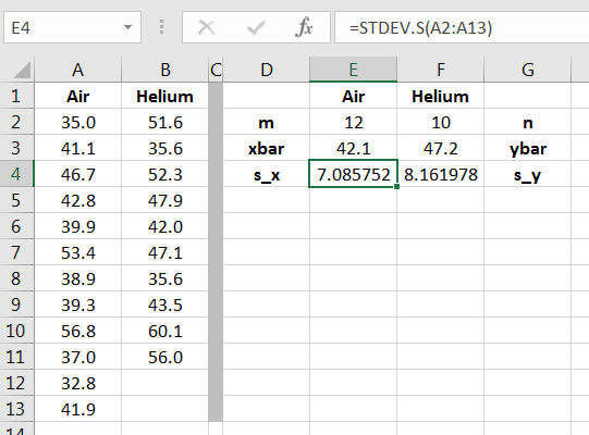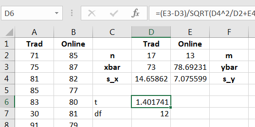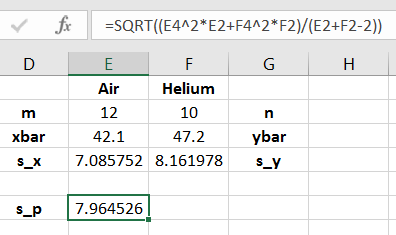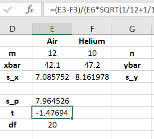 We will add to a repertoire of assessing when two standard deviations are not the same, but and do not strongly suggest different variances, so we will use the pooled test. The computation of using Equation (12.5) is shown in Figure 12.8.5050Make a note that what you get is between and If it isn’t, then something went wrong in the calculation.