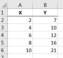 In Excel, create a scatterplot and find the equation of the regression line given the following data.