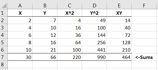 In order to calculate the expression for , it is useful calculate what , , and are for each of the data values. Hence, we can expand our table in Excel to include these values, including the sums of each of the columns.