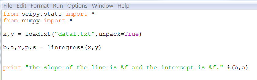 Open a script in Python and save it as Regression.py. Make sure you save it in the same directory your data file is saved. At the prompt, enter the following.