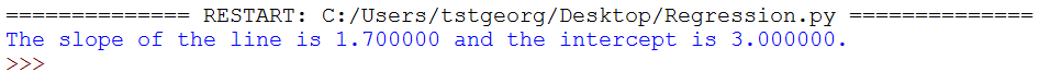 | print "The slope of the line is %f and the intercept is %f." %(b,a) |