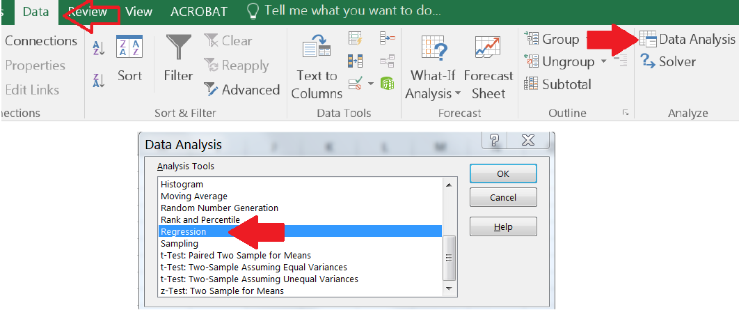 In the Excel Ribbon, go to Data Data Analysis Regression.