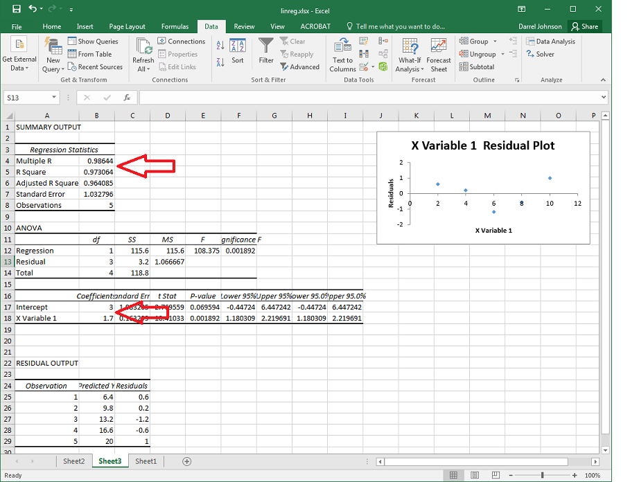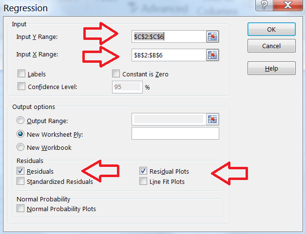 Select the range of cells where the data values for are. Then select the range of cells where the data values for are. You can also select options such as residuals and residual plots. We will not be discussing these here. When finished, select OK.