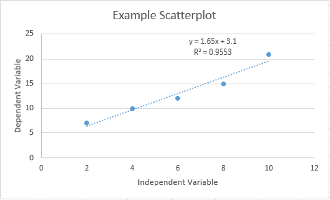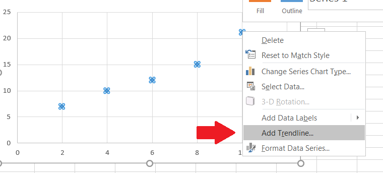 First, we need to make a scatterplot of the data. Once we have our scatterplot, we simply right click on one of the data points and then select Add Trendline in the dialog box that pops up.