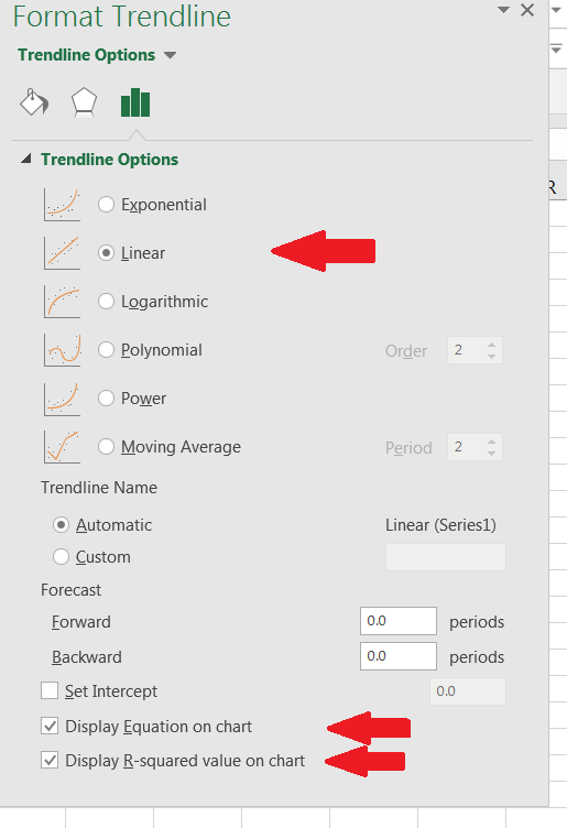 Next, the default setting with the Trendline function is linear, but we can apply it to other types of graphs as well. Make sure linear is selected. Also, check off the boxes at the bottom of the dialog box that are labeled Display Equation on chart and Display value on chart.