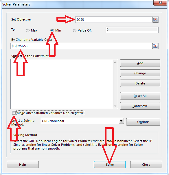 The Objective is the cell where you computed SSE; you need to set Solver to Min by changing the values in the cells where and are. Make sure to uncheck the box that says Make Unconstrained Variables Non-Negative.