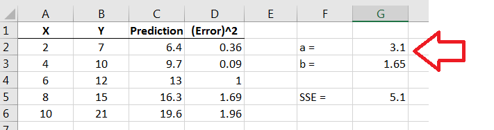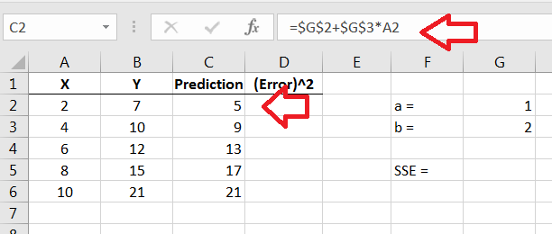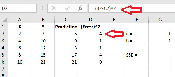 The process with Solver is to make a reasonable guess for and , use those guesses to make predictions for , compute the errors, and have Solver minimize those errors by adjusting our guesses for and . We need to square the errors (actual values - our predicted values) so that we don’t get any cancellations between positive and negative error values. Here is how we do this.