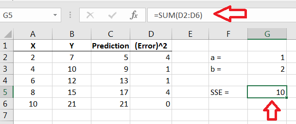 Now we can sum up the squared errors. This is the sum of the squared errors, or SSE for short.