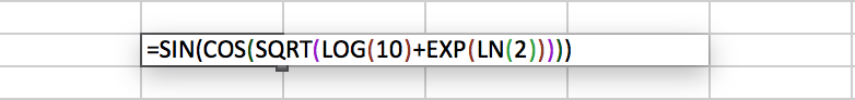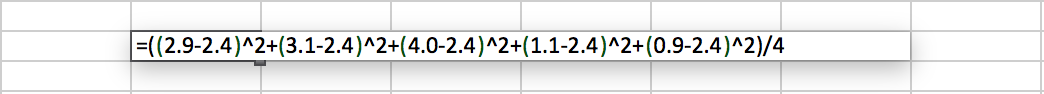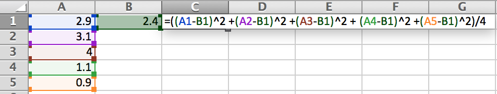 Noticing that the value shows up in each of the parentheses, input it into cell . We can now type the expression we wish to be calculated by calling the cells that our data is contained within. In cell , type the following:
