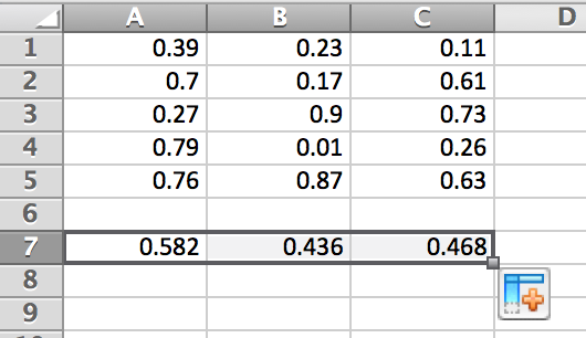 Notice that in this example, a couple shortcuts were implemented. One is the command . This is shortcut for adding up the data in specified cells. The other is the auto-fill feature in Excel. It allowed us to quickly evaluate the same expression across several columns of data. This feature will be used quite a bit throughout the book.