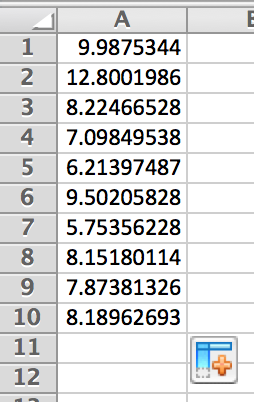 Pressing enter, a random population will be produced. Using Excel’s auto-fill feature, click and drag the lower right square down 9 more cells. This will produce the 10 randomly generated population values taken at 10 different times between 0 and 1 second.