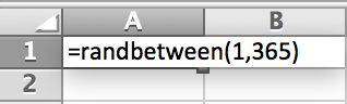 Not considering leap year, there are 365 possible values that could be potential birthdays. We can then randomly generate a number between 1 and 365 using a random number generator. Starting a new sheet in Excel, type in cell the expression