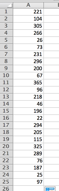 Pressing enter, we can then use Excel’s auto-fill feature to generate a random birthday 25 times. Click and drag the small rectangle in the lower right-hand corner of cell down until you reach row 25.
