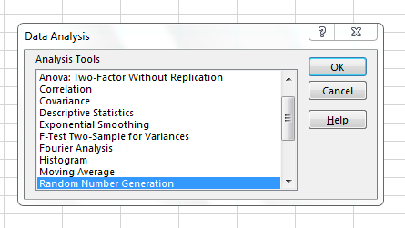 Upon clicking the Data Analysis button, a pop-up containing many statistical tools are available. Locate Random Number Generation as seen in Figure 3.16 and click ok. You should obtain another pop-up that looks similar to Figure 3.17.