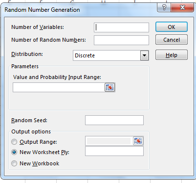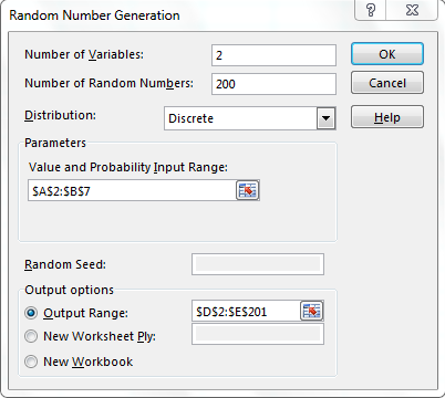 Since we have 2 dice, then there are 2 variables. We want to generate 200 random numbers for each of the variables. Since our variables are discrete in nature, we have selected this for the distribution entry. Either use the button