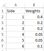 Note that the weights determine the how likely that side will arise. That is, the value of 1 will show up more than 4 or 5 since its weight is more.