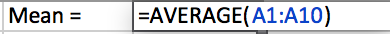 Let’s compute the sample standard deviation of 10 randomly generated data values using in Excel by using the formula and by using the command .
