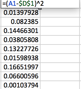 Notice that the formula has for each data value . Using auto-fill in Excel, we create a column that computes this part of the expression for each data value. Notice that we call the mean in each expression.