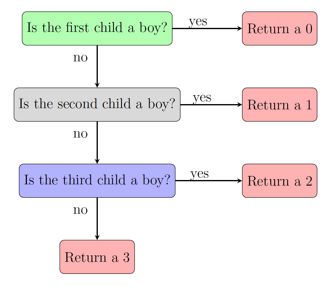 So, we are checking each step whether . (Why again?) Let’s amend the flow chart with the in place of Is the …child a boy. Figure LABEL:fig:FamPlan1 shows this. Since we are checking three steps to see if a boy is produced, we will have three if statements. Don’t forget that this flow chart represents the process to determine how many girls are in one family.