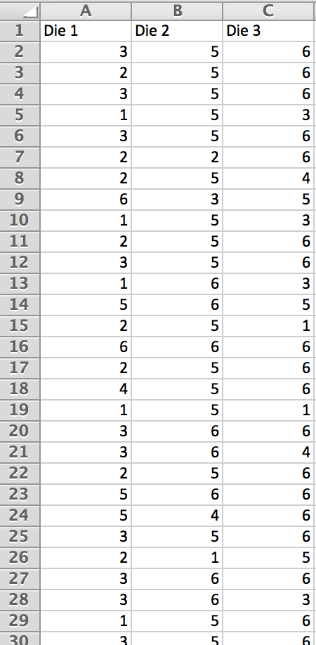 Let’s simulate this problem in Excel.1515Note that this problem can also be done theoretically. For the purposes of this text, we are motivated to simulate instead. From the description of the problem, the ultimate goal is to determine the possible outcome(s) that attains the largest population proportion.