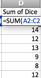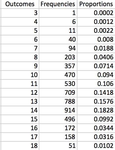 Before we create a frequency distribution, we need to determine what are all of the possible outcomes. Since the lowest side we could roll is a 1, then the smallest sum we could attain is 3. Similarly, the largest is 18. Therefore, we have the following outcomes that are possible.