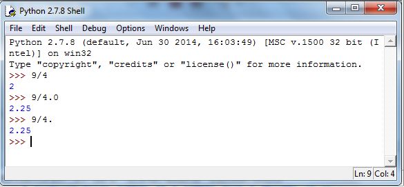 Division and exponentiation, however, are both different in Python. If and are integers, x/y will compute the quotient of divided by 1616Henceforth, Python commands will be displayed using this font. For example, try 9/4 in the Shell, and you’ll get 2. To get a floating-point approximation to one of the two needs to be a floating-point number.1717You can think of a floating-point number as a number with a decimal in it. The simplest option is to type 9/4.0, and you’ll get 2.25. Figure 5.4 demonstrates.