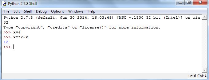 Another way we can use Python like a standard calculator is with storing numbers. But, with Python we can do so more elegantly, and with greater power. We can assign values to variables in Python, and then compute with them symbolically. To assign a value, we use the equal sign, =. For example, executing x = 4 will store the value of 4 into x. (We’ll discuss naming things as we develop examples.) Then executing x**2 - x will yield the correct value, as shown in Figure 5.7.