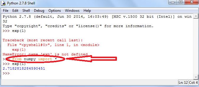We you start Python, a minimal number of commands are automatically loaded. For example, you will recall the exponential function of base As with Excel, this function is called using exp(). But, before calling the function, we need to load it. Try executing exp(1) in Python and you will get an unsightly error. There is a large number of libraries of commands for Python, and we will rely on the one named numpy. This library contains many definitions of functions for working with numbers, including the familiar functions on a scientific calculator. The following command will load the library: