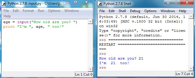The command raw_input allows the user to prompt the user for input as well. However, it stores the input from the user as a string instead of a numeric value. Let’s try an alternative way of printing out a statement that relies on the value of a variable to be placed within the sentence. Type the following in IDLE and then run in the Shell:
