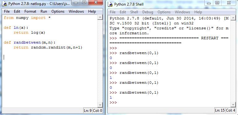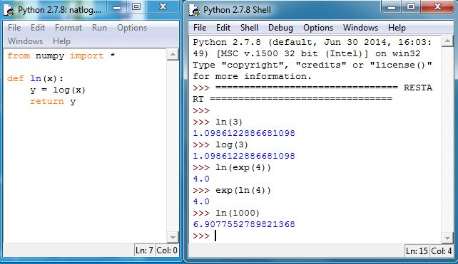 Including a line that loads numpy, enter the above into IDLE, and run the module. If you execute ln(3) in the shell, you’ll get the same thing as log(3). Figure 5.13 shows the results: