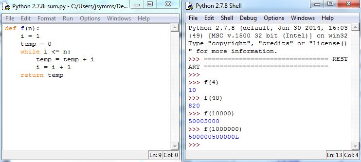 Remark: Note the last output: 500000500000L. Python stores large integers in a special way, and that’s what the L denotes, but it doesn’t have an effect on the value and can be ignored.