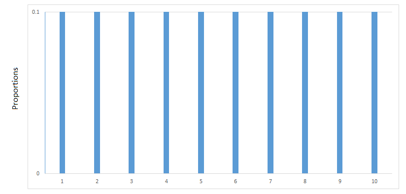 Secondly, we will assume that the proportions of the numbers in the population are the same, meaning that the population distribution is uniform. The population distribution can be graphed as follows: