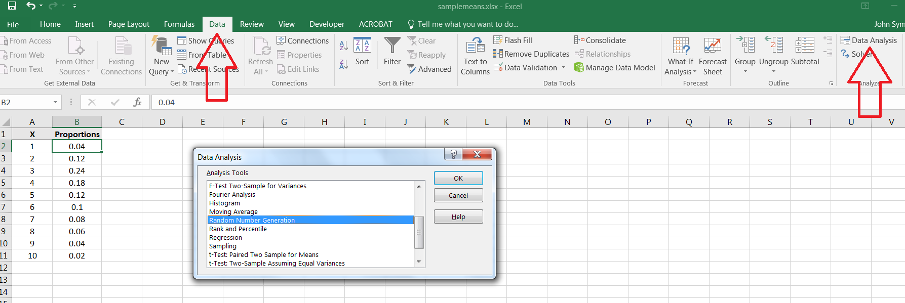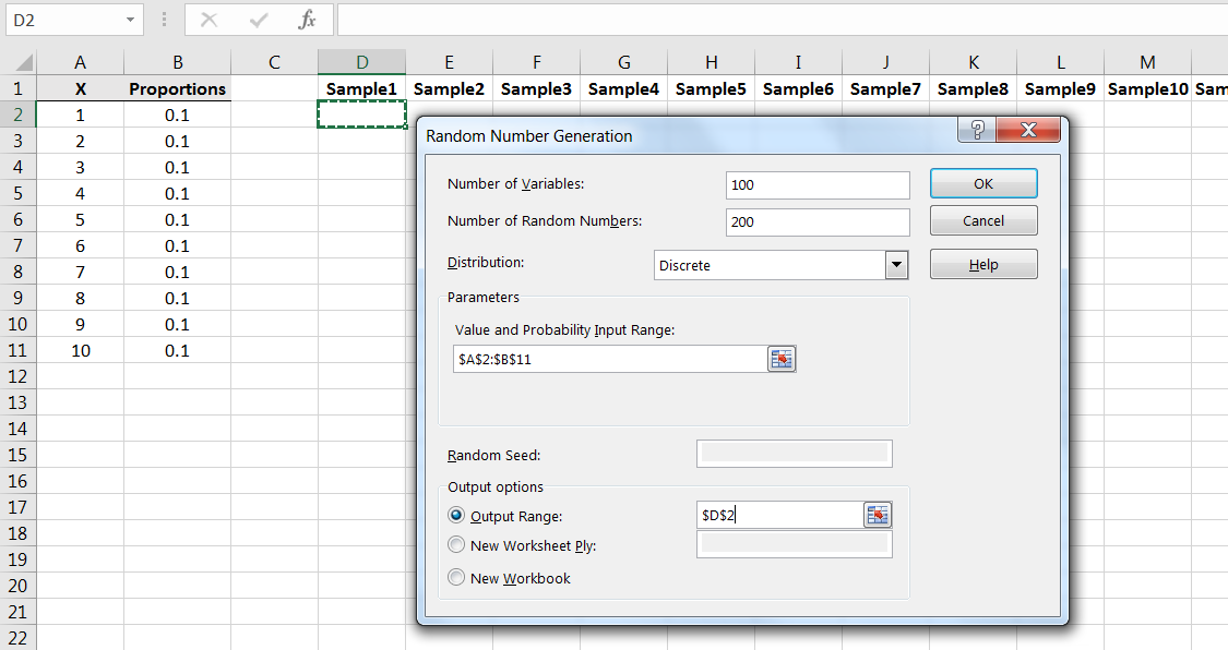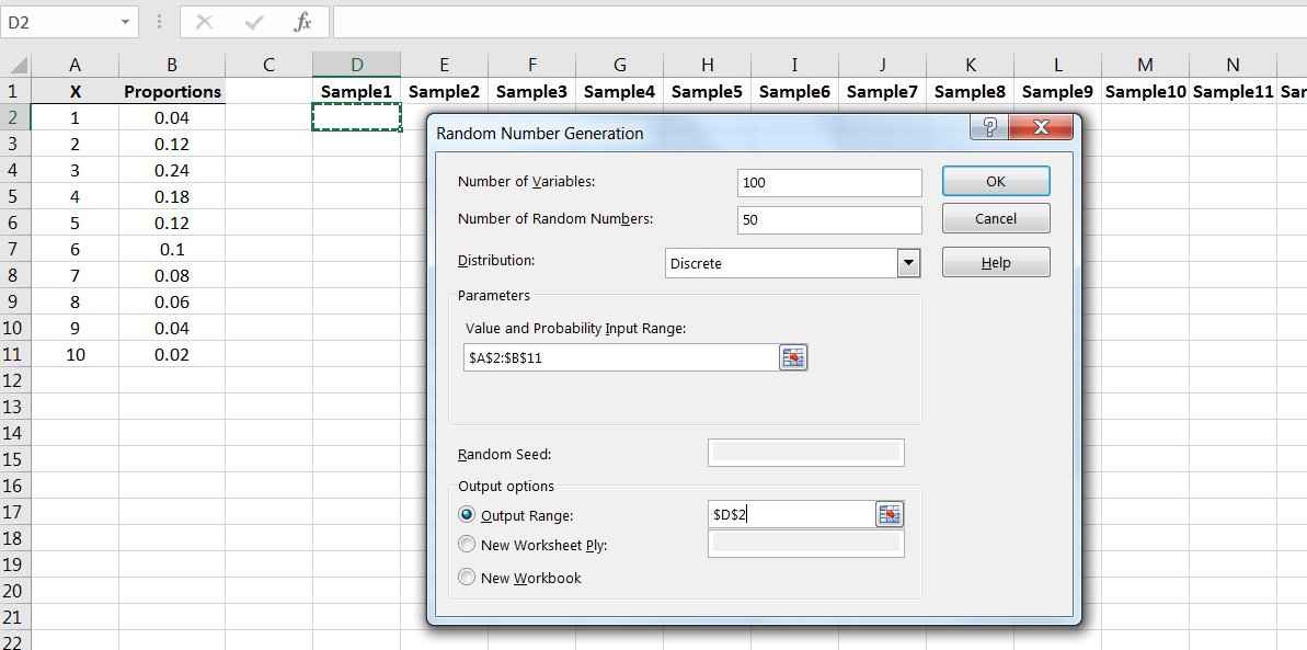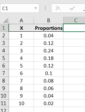 We can simulate samples from this population using Excel’s Random Number Generation command in the Data Analysis library.2424It’s also possible to simulate samples from this population using the Excel commands RAND() and IF() First, we need to input the values and proportions into Excel as follows: