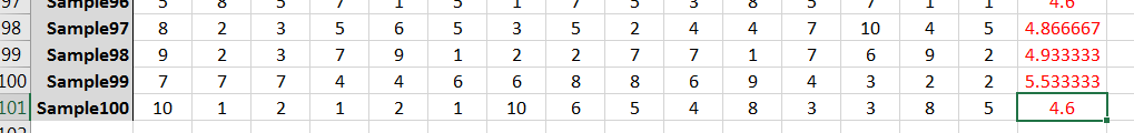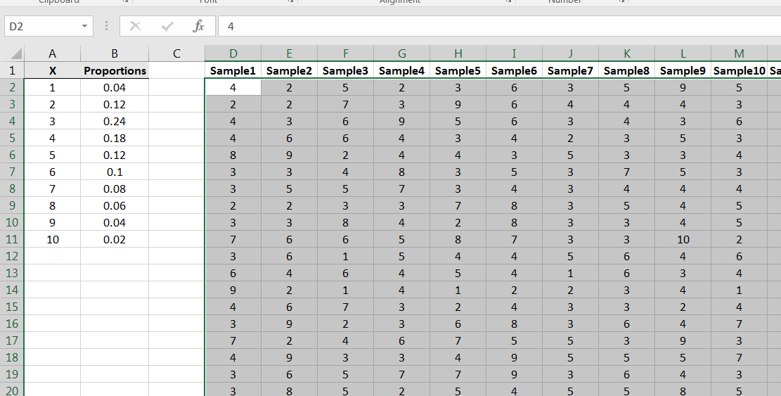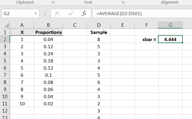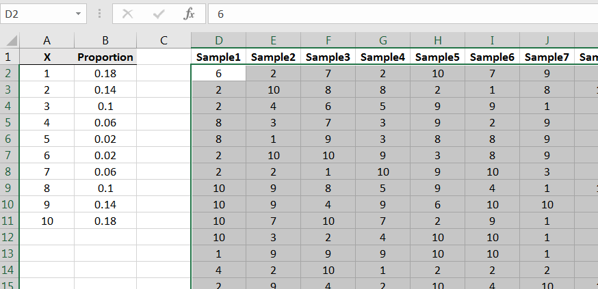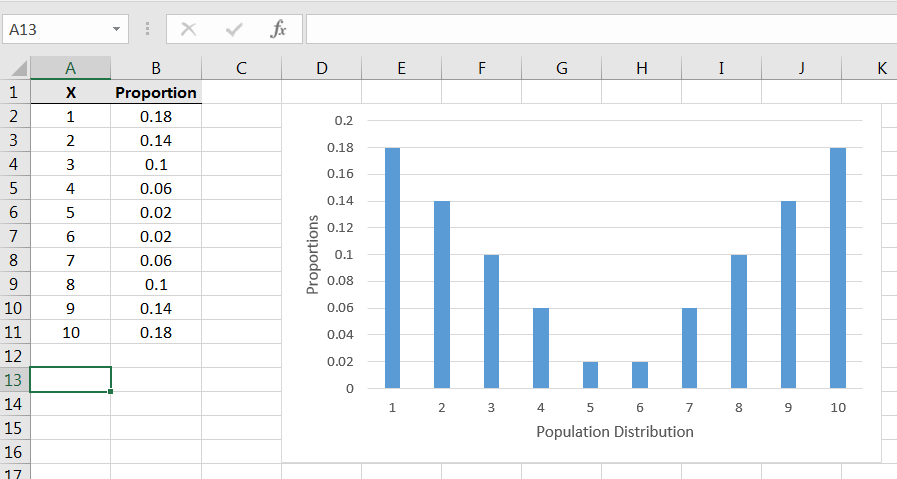 This population has a mean and if you suspect that the mean is equal to 5.5, then you are correct. The question at hand is how will sample means behave given that the population distribution is as above. Using Excel, we can build intuition of the behavior of via simulations.