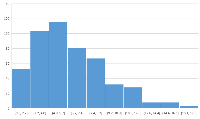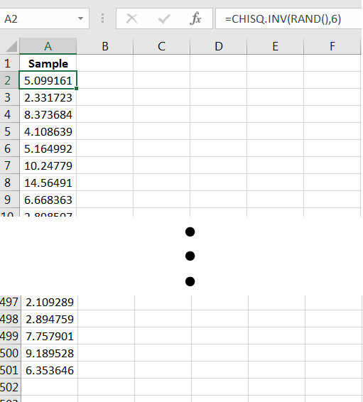 As a final example, we’ll use a population in which the numbers are continuous, i.e., numbers that span an interval. The distribution we will use is called a distribution with 6 degrees of freedom. Generating random numbers from the distribution can be done via the Excel command =CHISQ.INV(RAND(),6). We can visualize the distribution via a histogram of a large sample, say