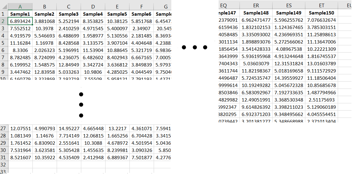 Each column of 50 numbers is a sample of size 100 from the population: