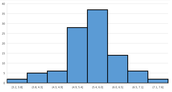 Most of the ’s are between 4.0 and 7.0, i.e., the ’s are more likely to be “close” to 2323It is possible for most of the ’s (6 or more of the 10) to be either less than 4 or greater than 7, but that will happen to fewer than 0.0001% of readers. Note that in Figure 6.4 100% are between 4.0 and 7.0. It’s likely the case for you as well.