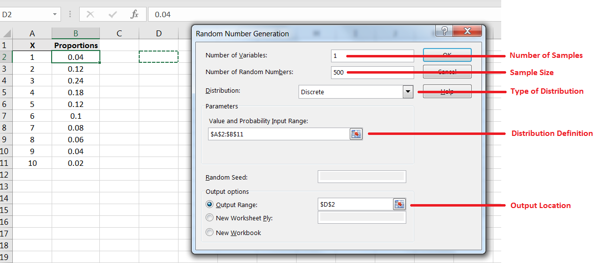 To generate a single sample of size 500, input as shown in Figure 6.11. Note the function of each field.