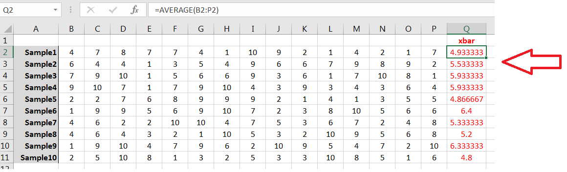 Use AVERAGE() to compute the sample mean for each sample: