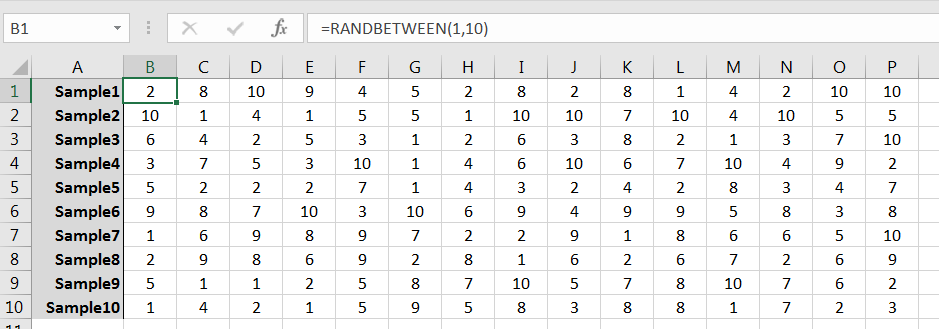 The command RANDBETWEEN(1,10) can be used to simulate randomly selecting a single member of the population. Repeated use of the command can be used to generate a sample, and from there many samples. For example, 10 random samples of size 15 might look like those given in Figure 6.3. (Note that the samples as given row-wise; column-wise would work fine too.)