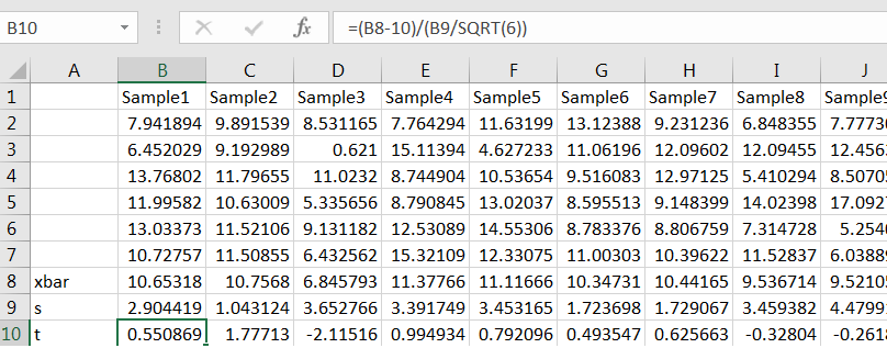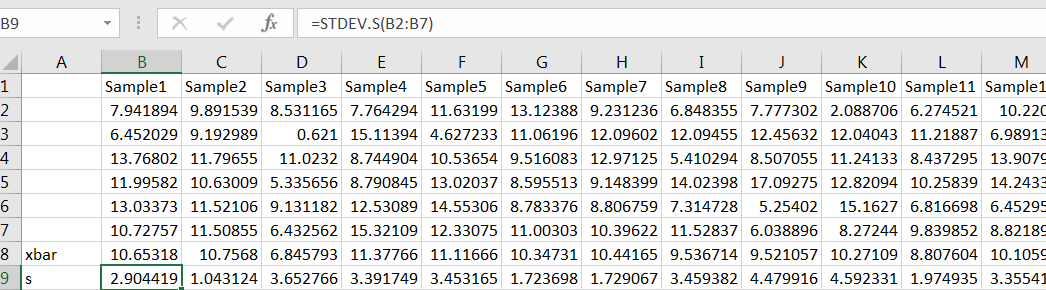 For example, let’s estimate with using a simulation. For the population from which to sample, suppose that (Pick your favorite values for and you need not pick 10 and 3.) For we need samples of size Use Excels random number generator to simulate a large number, say 1000, samples of size 6, computing and for each sample: