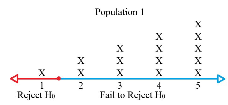 To illustrate, suppose that we again use the decision rule of “reject if the number selected is 1 or less.” And suppose upon selecting the population, the number 3 is chosen as the sample. Since 3 does not fall with the rejection region, we fail to reject i.e., there is insufficient evidence to reject Figure 9.3 gives a visualization of the regions.