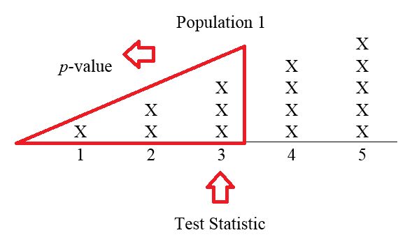 For example, suppose that the number 3 is chosen. Then the corresponding -value is computed by answering the following question: Assuming the chosen population is Population 1 ( is true), what is the chance of observing a 3 (the test statistic) or anything smaller (more extreme)? Thus, if a 3 is chosen, then the -value is 6/15, or , since there are six numbers in Population 1 that are 3 or less. Figure 9.7 illustrates.