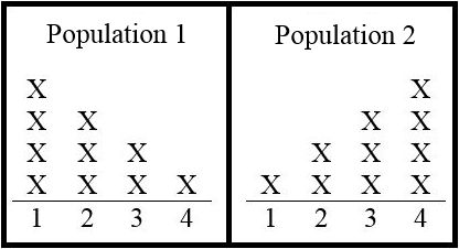 Example: Suppose that two populations consist of numbers as follows: Population 1 contains four 1’s, three 2’s, two 3’s, and one 4; Population 2 contains one 1, two 2’s, three 3’s, and four 4’s. Figure 9.5 illustrates.